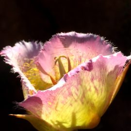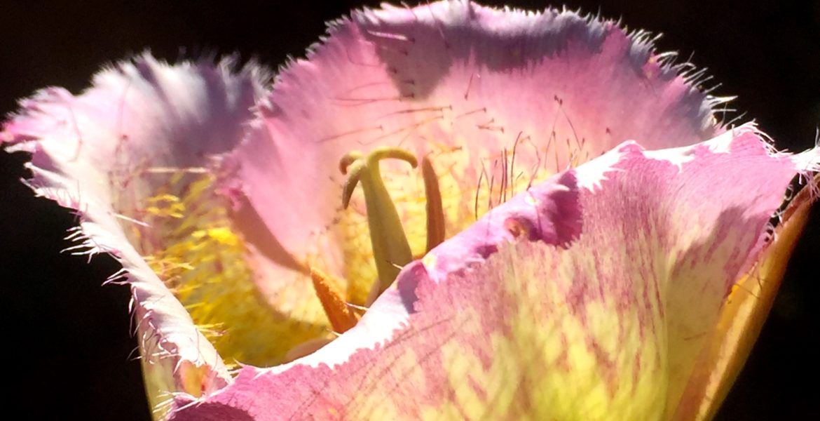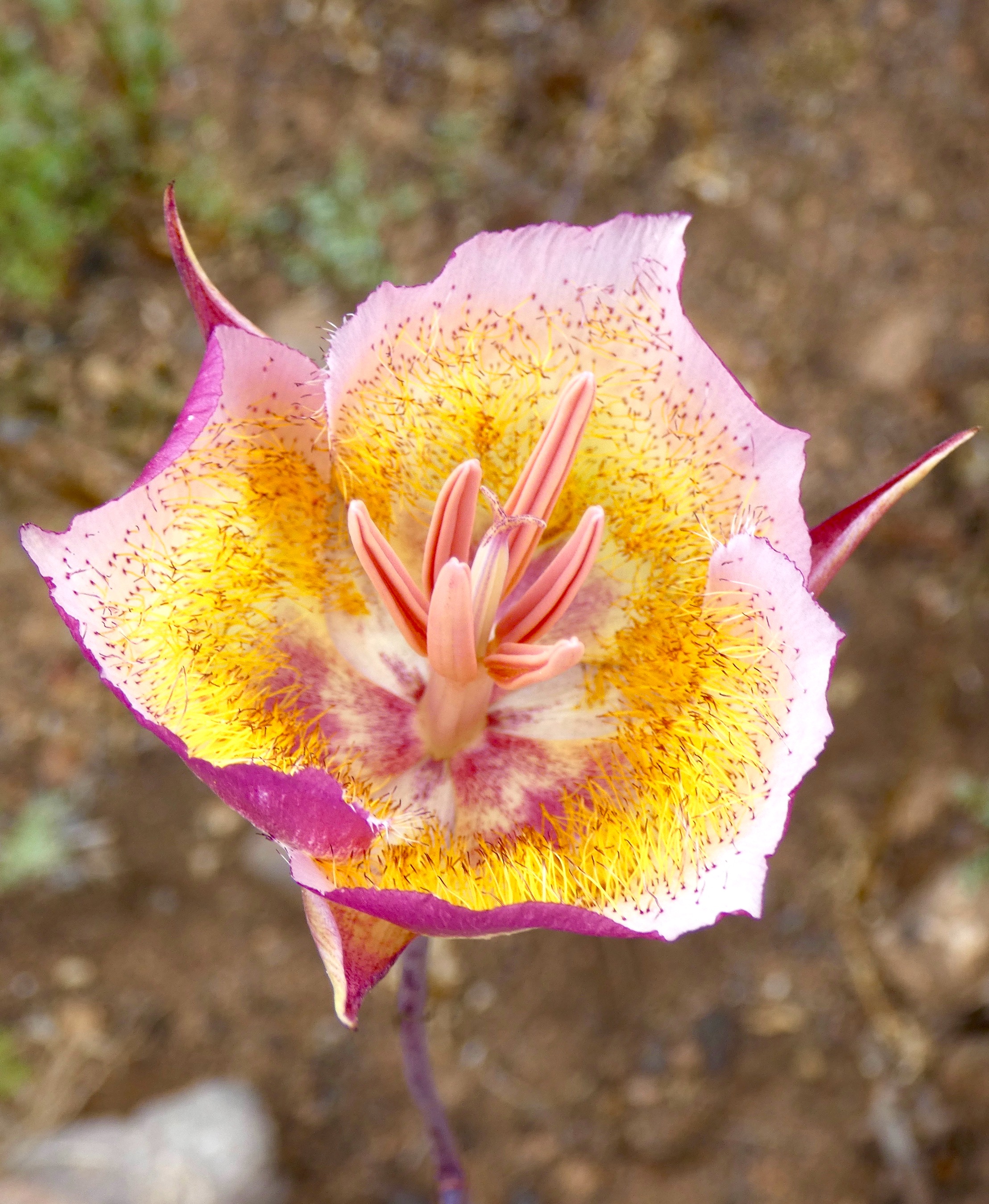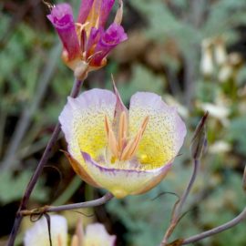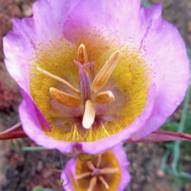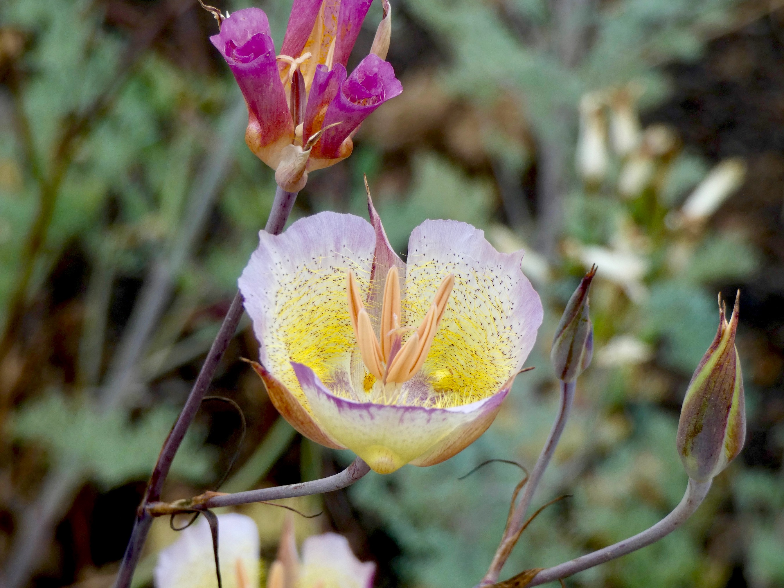Plummer’s mariposa flowers range from pale pink to raspberry red, with a band of yellow that can be pale cream or bright gold. The interior of each tulip-like blossom is covered with colorful hairs that give it a distinctive “furry” appearance. This plant is a bee magnet. Nectar glands—one on each of the flower’s three petals, visible as small round bulges—tempt pollinators deep into the flower.