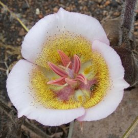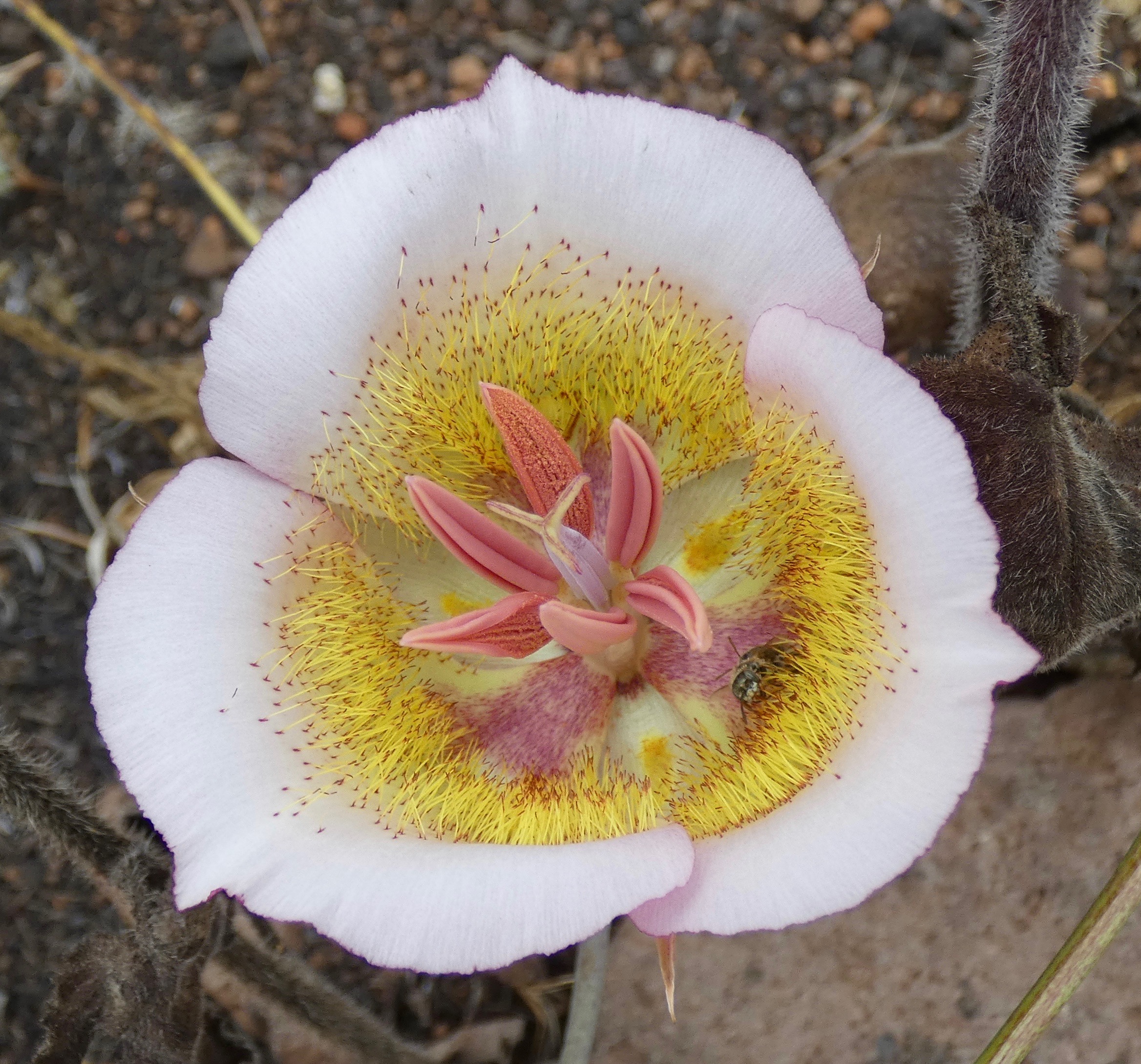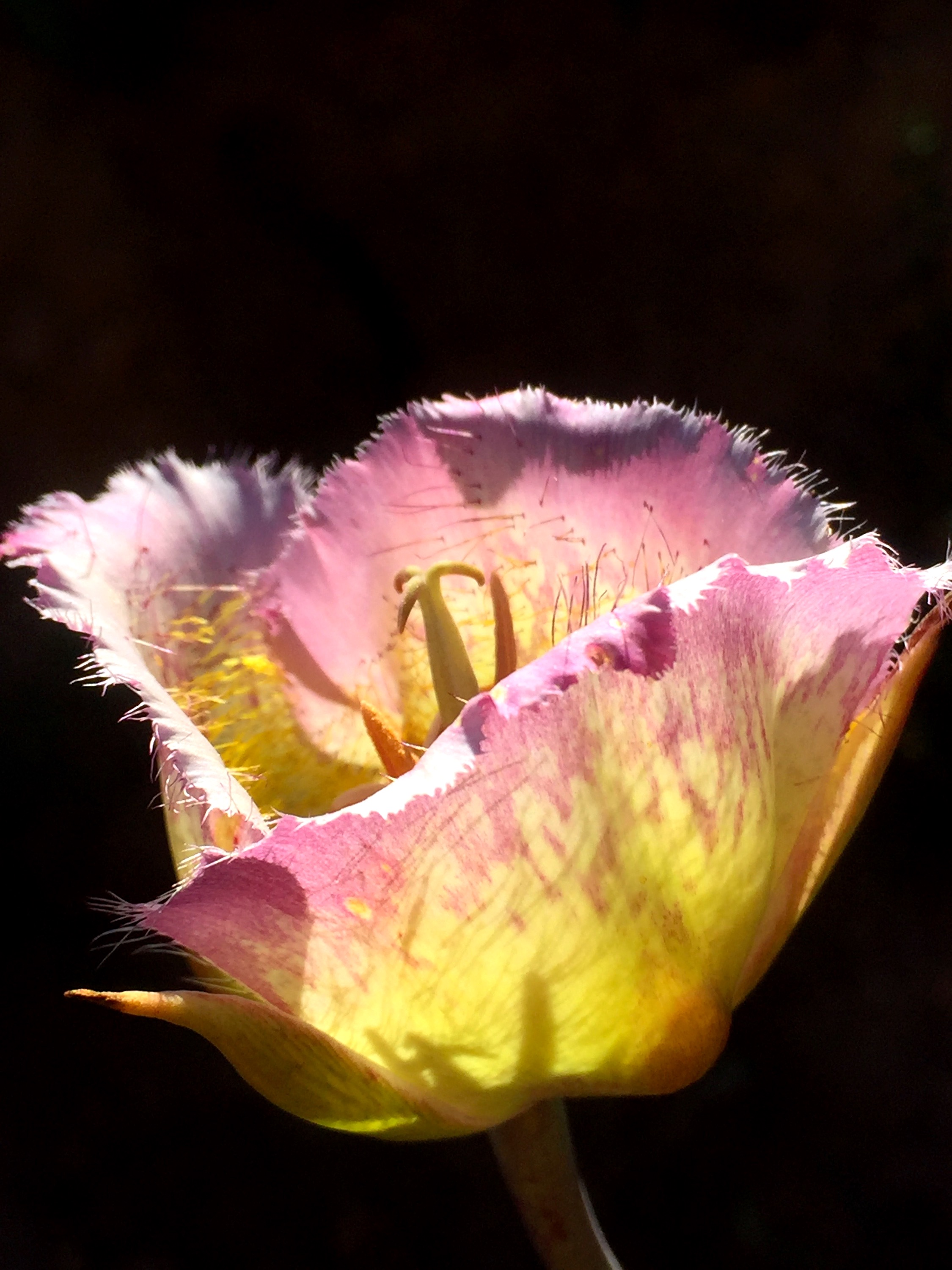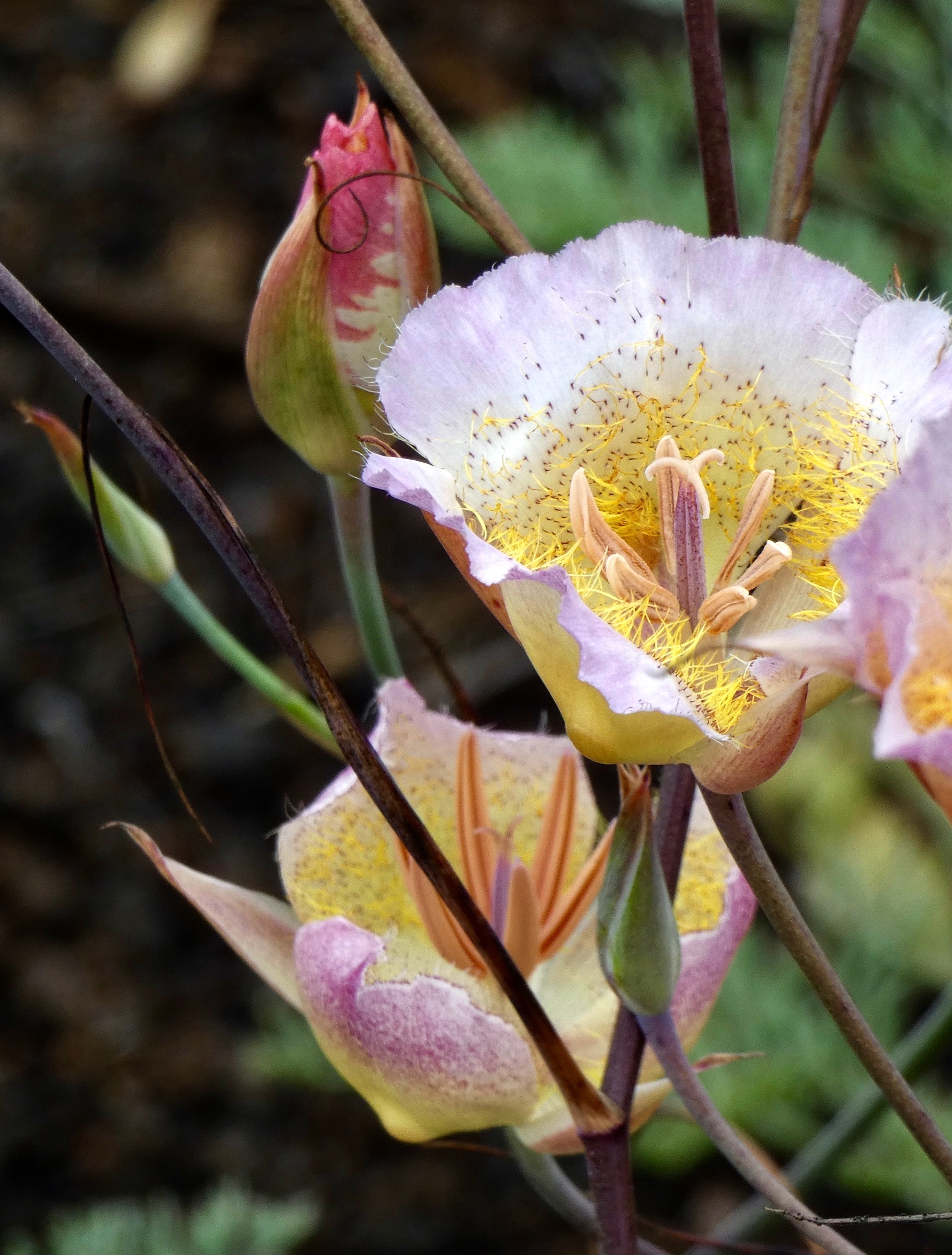 Plummer’s mariposa flowers range from pale pink to raspberry red, with a band of yellow that can be pale cream or bright gold. The interior of each tulip-like blossom is covered with colorful hairs that give it a distinctive “furry” appearance. This plant is a bee magnet. Nectar glands—one on each of the flower’s three petals, visible as small round bulges—tempt pollinators deep into the flower.