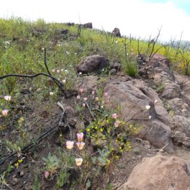 Plummer’s mariposa lilies are in abundant bloom throughout the Woolsey Fire burn zone, but they can also be spotted in areas that did not burn, including Tuna Canyon Park and Topanga State Park. Look for this rare beauty in clearings among the chaparral and sage scrub, and on dry, rocky slopes.