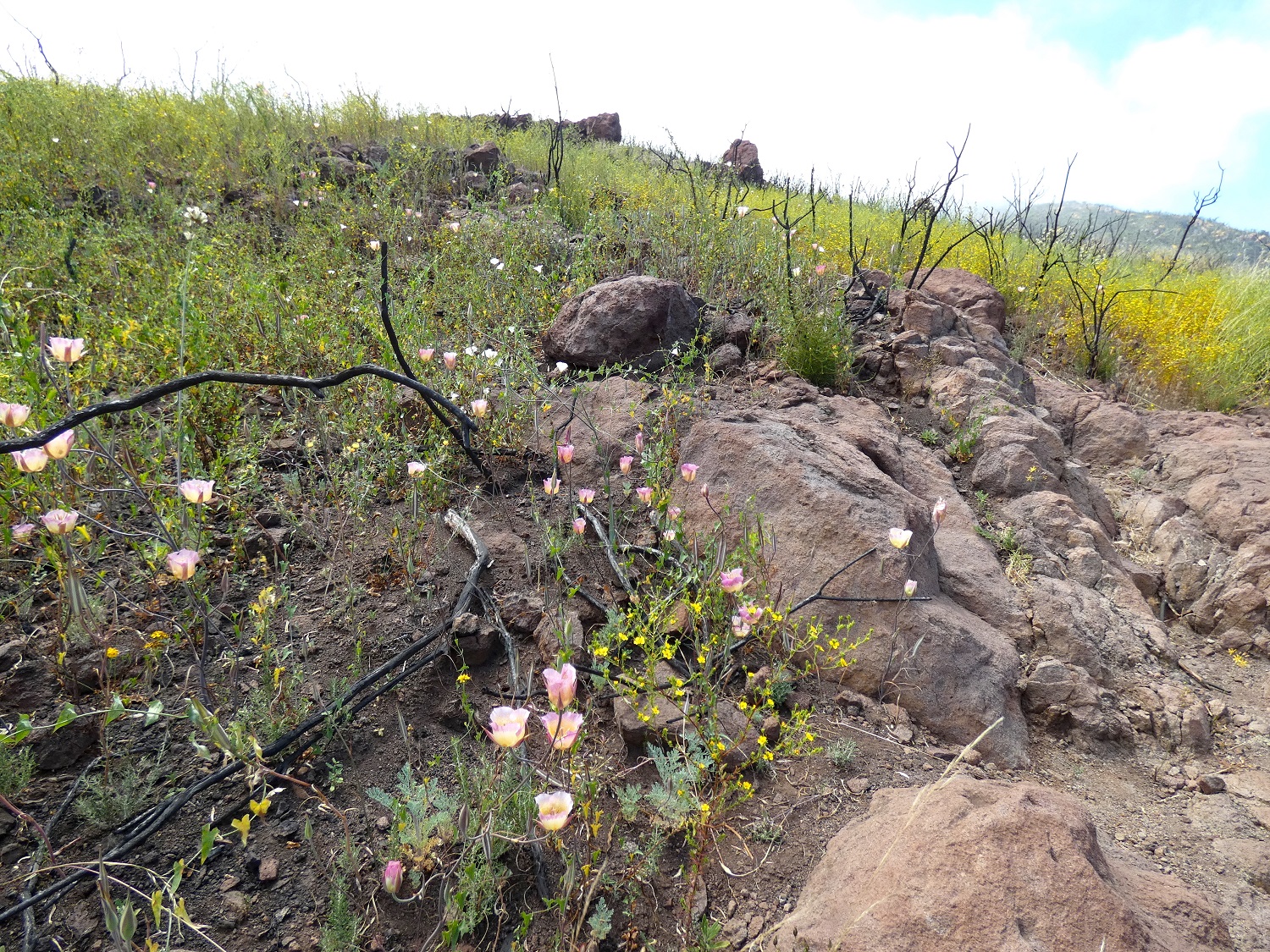 A field of Plummer’s Mariposa Lilies in all their unexpected glory was discovered growing in the Woolsey Fire burn scar near Sandstone Peak. Photos by Suzanne Guldimann