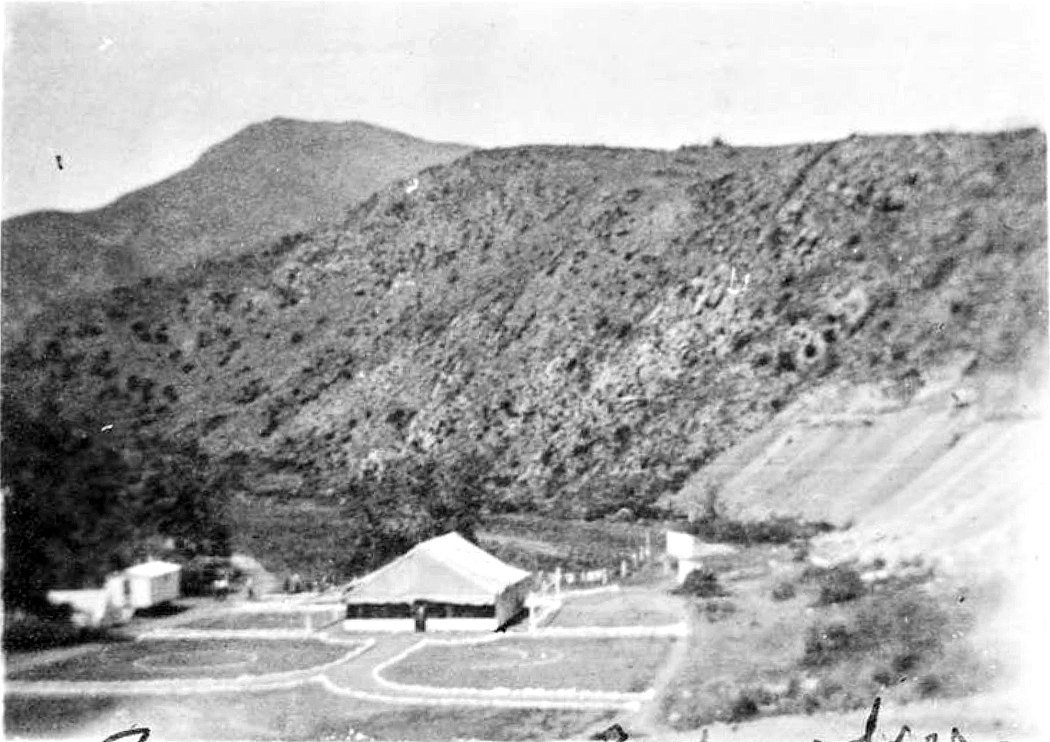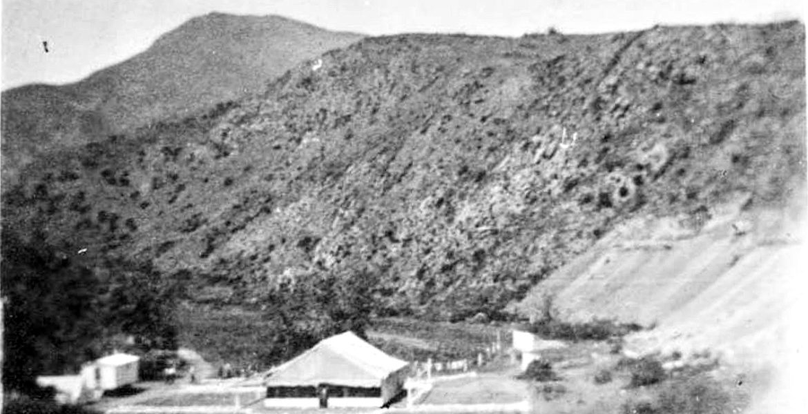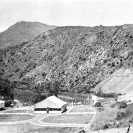 The LA County Prison chain gang had been in Topanga on and off as early as 1898, when they worked on the first Canyon road. A stockade built near the beach in September 1911, housed them while they were doing improvement work, but two months later, a wildfire passed through and likely burned it. A more permanent camp was created in April 1913, when the chain gang was tasked with building a whole new canyon road that would stay on the south side of the creek until the S-turns, eliminating the inconvenience of multiple crossings. The camp had “…a large steel cage where the men are kept. This cage is covered with a tent and inside the bunks are placed tier upon tier so that there are sleeping quarters for nearly a hundred men….The ‘village’ is the last word in neatness, and the rock bordered walks from tent to tent, with the trees and canyon as a background, make a beautiful scene.” (“Santa Monica’s Points of Beauty and Interest,” July 26, 1913, The Daily Outlook)