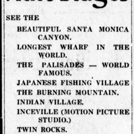 “First there is Santa Monica Canyon itself, said to be the place where vast pirate treasures have been hidden. Then there is the long wharf, the longest in the world, and just beyond this is the Japanese village, always a source of wonder to visitors in California. The burning mountain, whose fame is nation-wide and whose solution is the enigma of scientists is seen on this trip. Santa Ynez canyon and the famous moving picture camp and village is one of the main stops…. The county convict camp at the mouth of the [Topanga] canyon always proves a point of interest and is within a stone’s throw of the terminus of the line.” (“Bus Line on Coast,” July 28, 1914, The Daily Outlook)