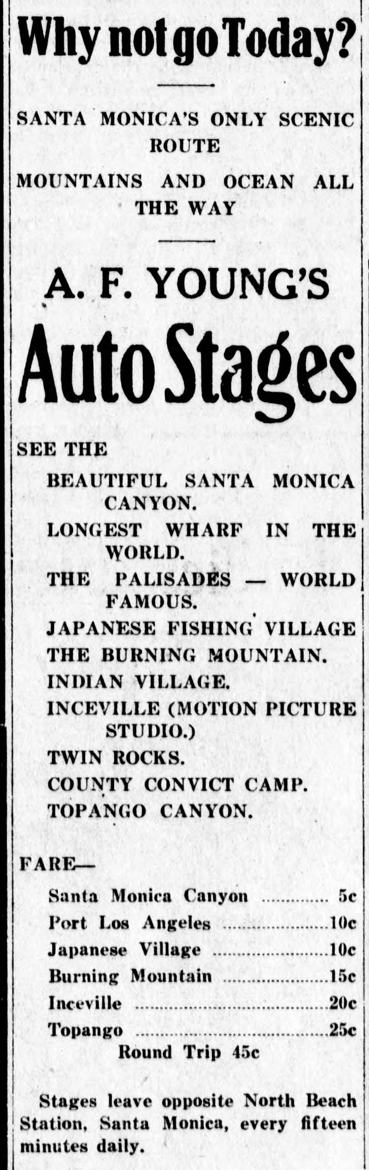 On July 29, 1914, Santa Monica realtor Al F. Young, 41, started a bus line to Topanga Beach that he advertised as a sightseeing tour.