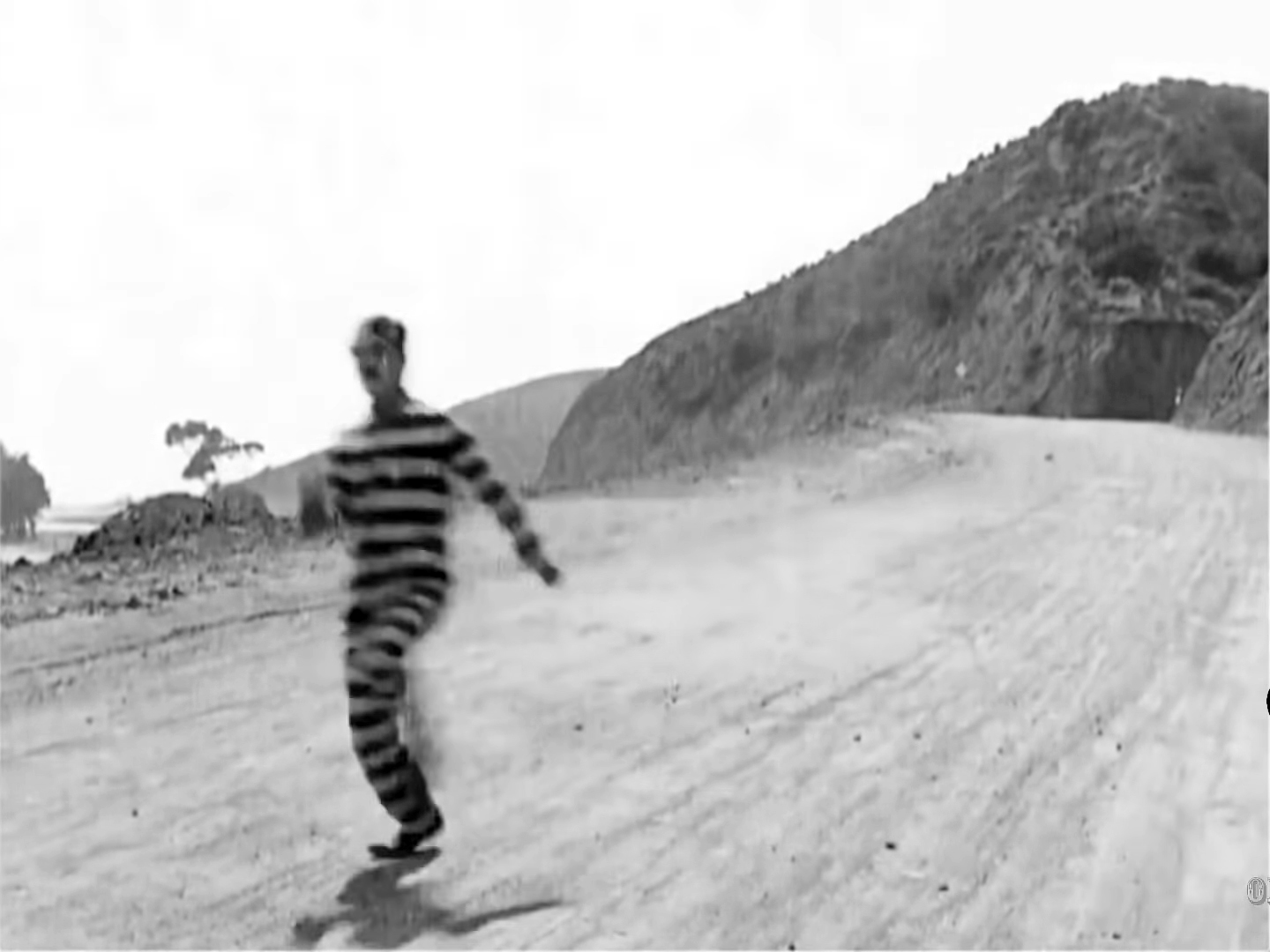 This is a screenshot of Charlie Chaplin running at the entrance to Topanga in The Adventurer (1917) that was filmed at Topanga Beach. The plot is, "The Little Tramp