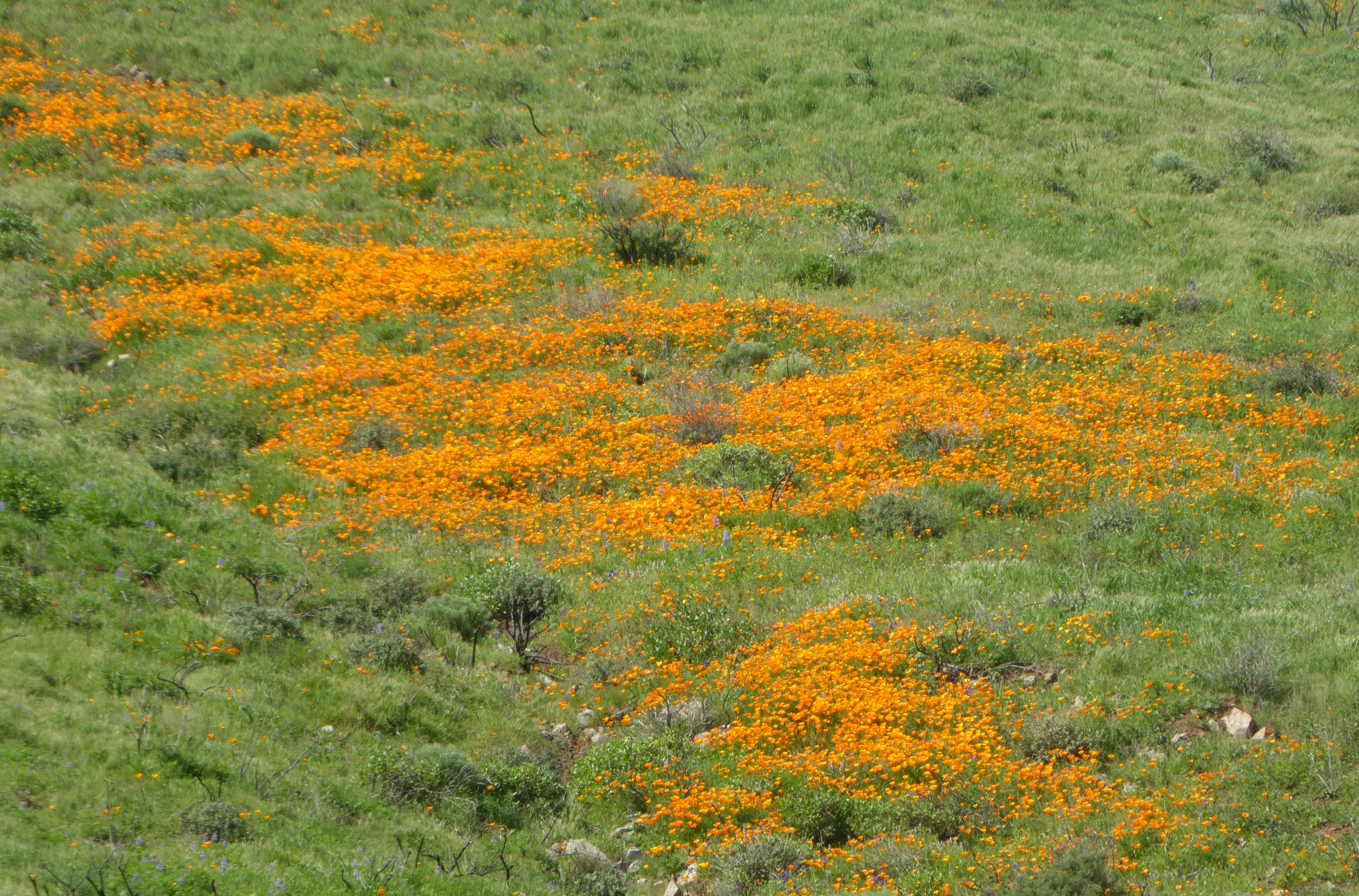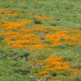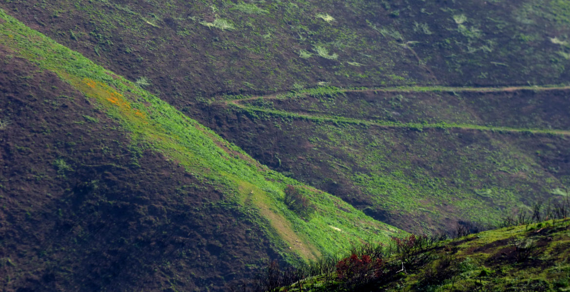 Flowers to look for in the burn area as spring progresses include fields of California poppies and lupines, along with other annual wildflowers like clarkia, larkspur, gold fields, ground pinks, and owl clover.