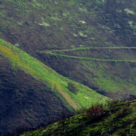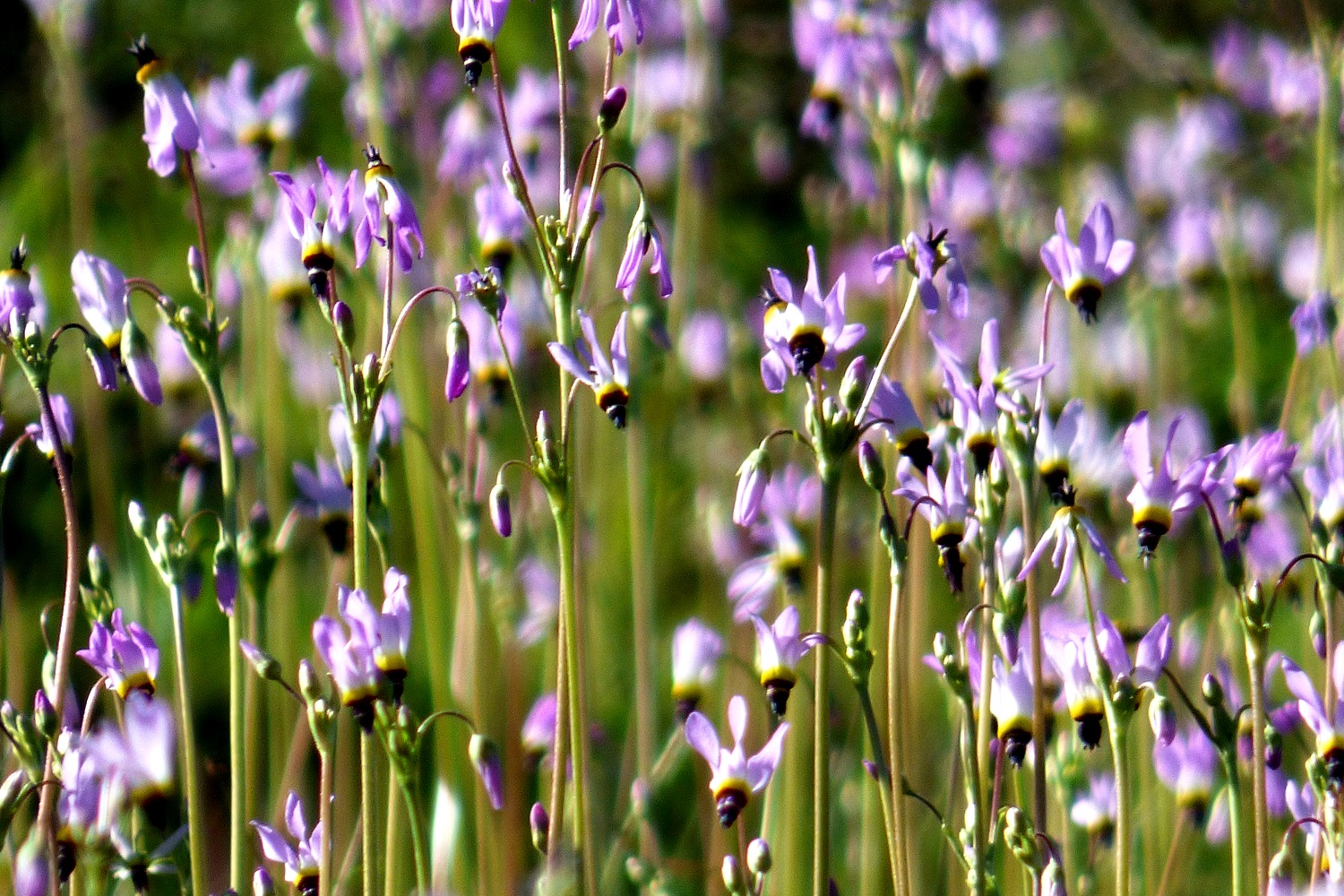 A proliferation of Padres shooting star (Primula clevelandii) catches the light on a hillside in the Woolsey Fire burn area. This short-lived flower is usually one of the first to bloom in late winter. When conditions are right, as they are this winter, it can cover entire hillsides. In a dry year, all one may encounter is a solitary plant.