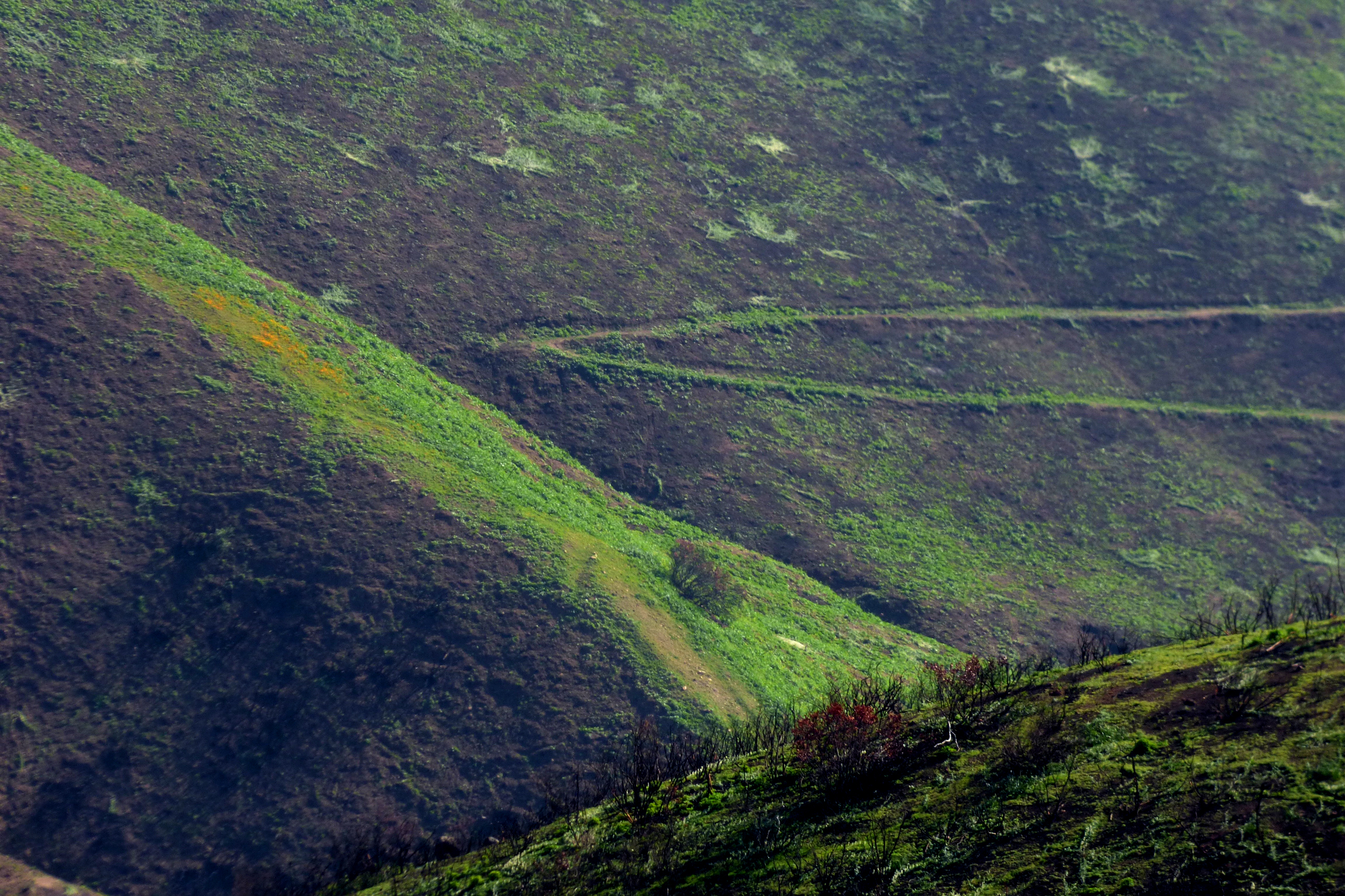 The biggest transformation wrought by the rain is in the Woolsey Fire burn scar, where new growth is covering blackened hillsides with vibrant green, and the promise of rarely seen fire followers, herbaceous flowering plants that are only abundant after a wildfire.