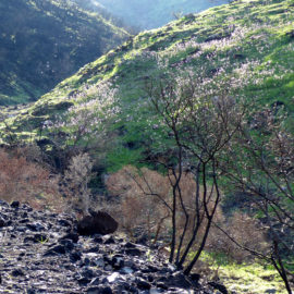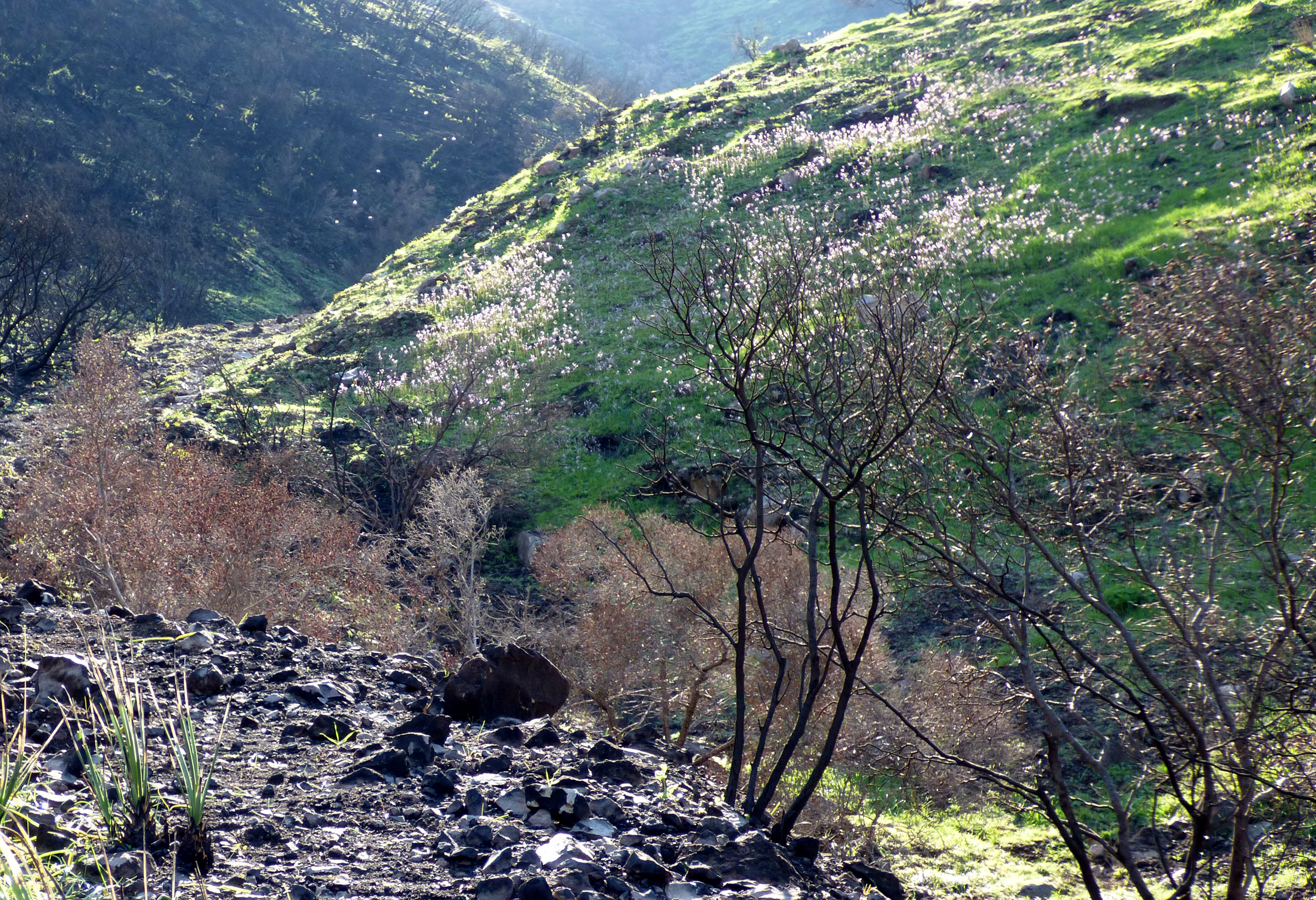 In December, the Messenger Mountain News accompanied Mendelsohn into upper Trancas Canyon, an area so hard hit by the fire that it resembled the surface of Mars. More than 14 inches of rain later, the blackened oak trees in that canyon are beginning to re-sprout, and patches of the canyonside are carpeted in ethereal pink shooting star flowers (Primula clevelandii), and dense mats of tiny, sweet-scented wild cucumber flowers (Marah macrocarpus).