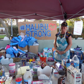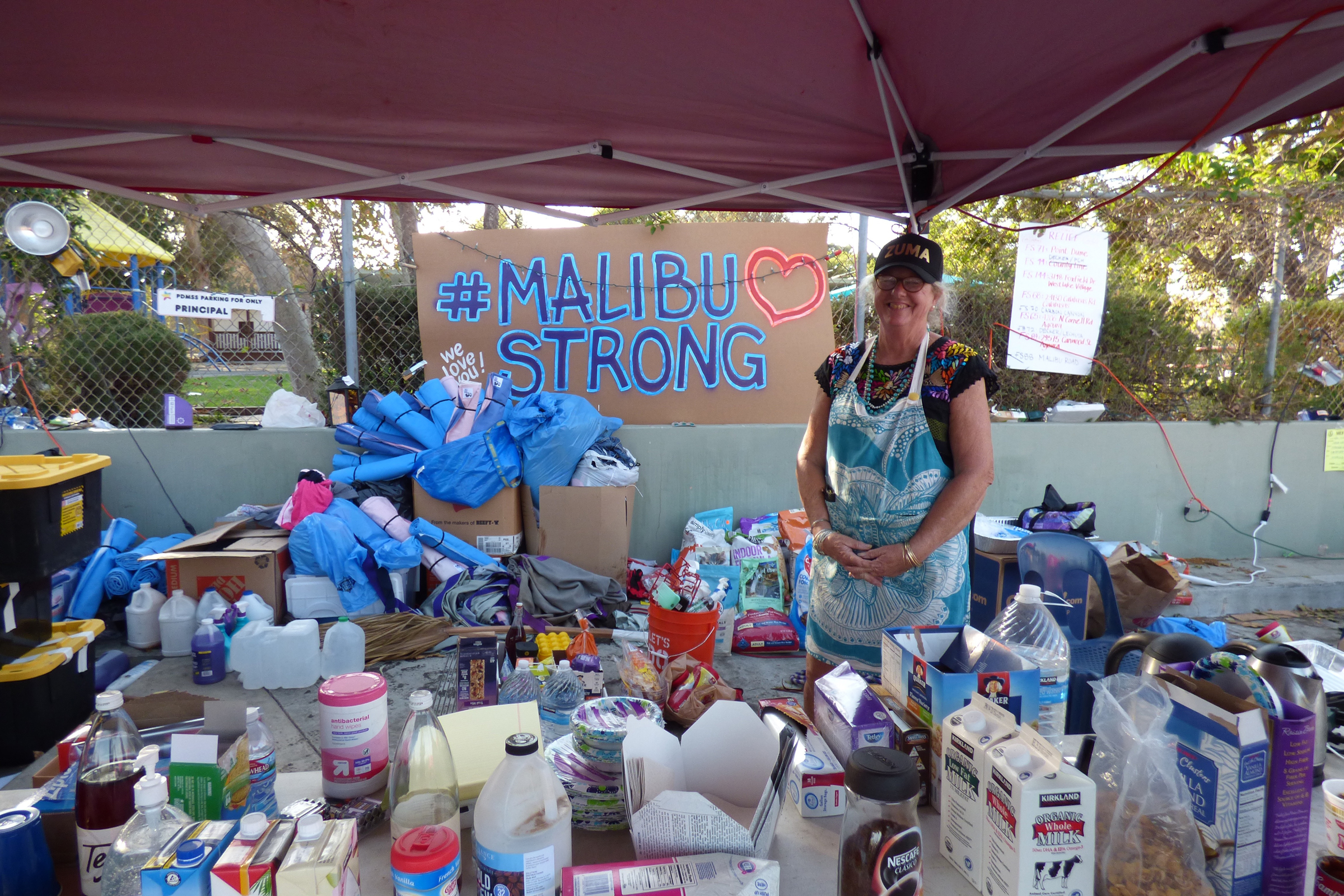 Longtime Malibu resident Dru Ann Jacobson hands out supplies and encouragement at the emergency supply depot established.
