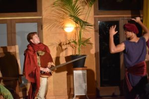 The pièce de resistance of the evening was the annual performance of St. George and the Dragon. In this slapstick version, Melora Marshall was the Eqyptian Queen (“Is there a doctor in the house?”); Lexi Pearl was the aerial dancing princess promised in marriage to Dane Oliver as St. George. As if slaying a dragon wasn’t enough, George also slayed a Turkish knight and a giant, but kept ending up dead, himself, ergo, Gerald Rivers as the increasingly tipsy witch doctor with steep prices for his services (“Fifteen pounds??!!”), who brings him back to life until…the play has to end. Max Lawrence played the fiendish Turkish Knight, Elizabeth Tobias was Little Jack, sidekick to Tom Allard who towered as the Giant Blunderbore. All came back to life for curtain calls and raucous applause.
