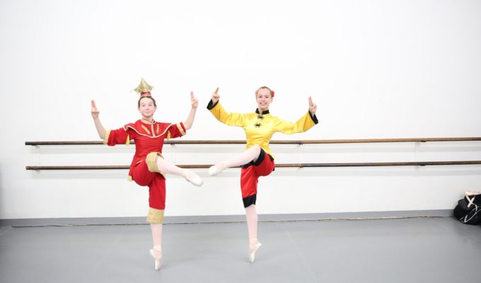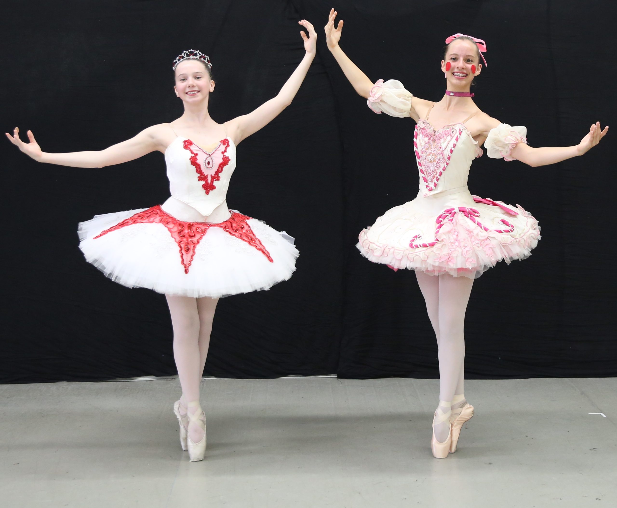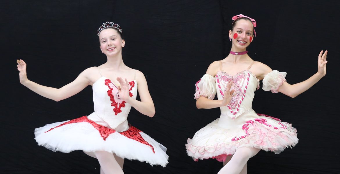 Sidney Brody and Zoe Mack prepare for their “Doll” solos in this year’s Nutcracker. Photo by Todd Lechtick