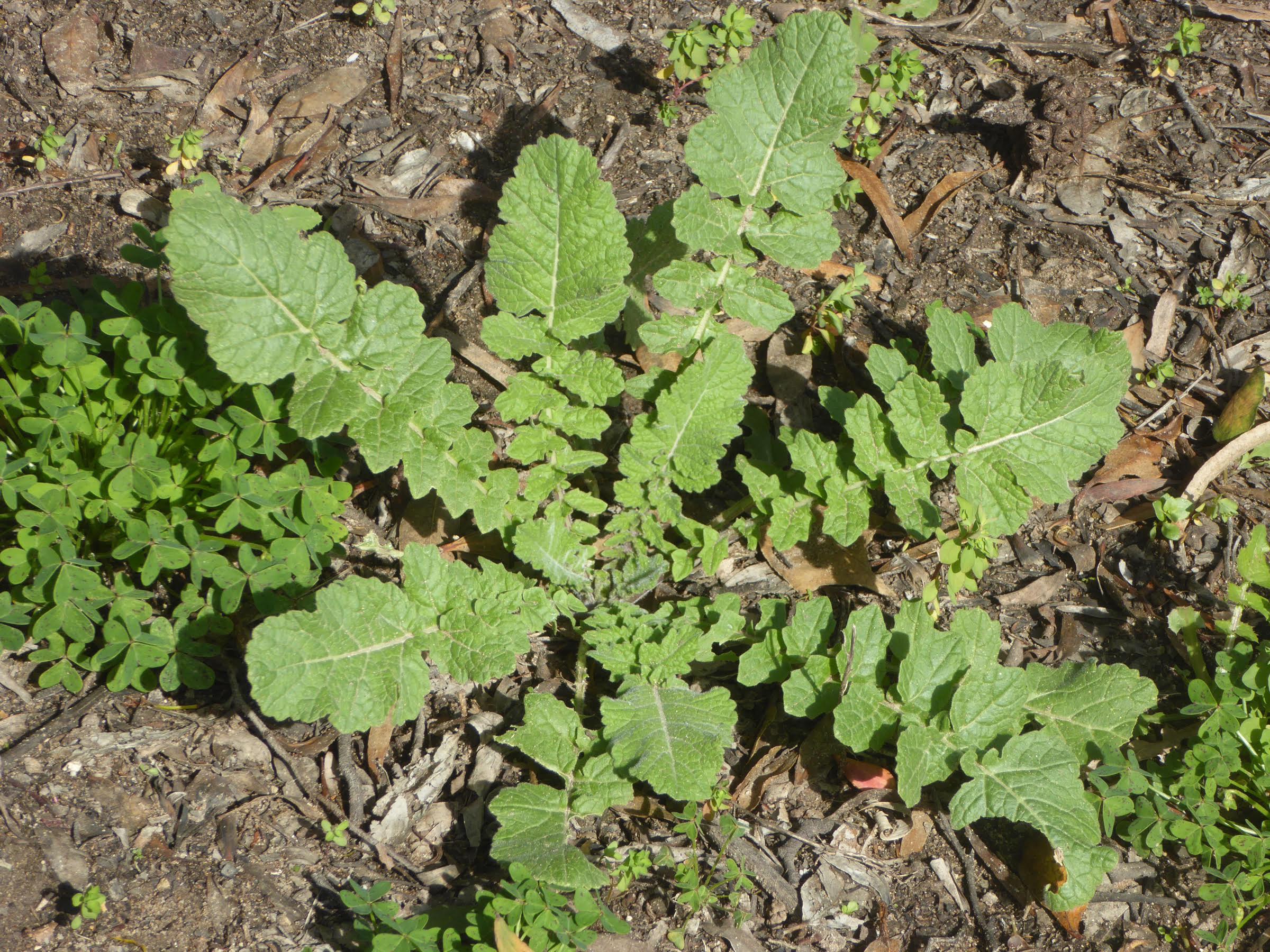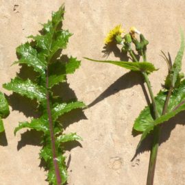 Other edible weeds have a longer history in California. Sow thistles are said to have arrived with the first European livestock. Two types of sow thistle are common in the Topanga area. Sonchus oleraceus, the common sow thistle, and Sonchus asper, the prickly sow thistle, crop up everywhere. Both varieties are edible, but just like their close relative the dandelion, they can be extremely bitter.