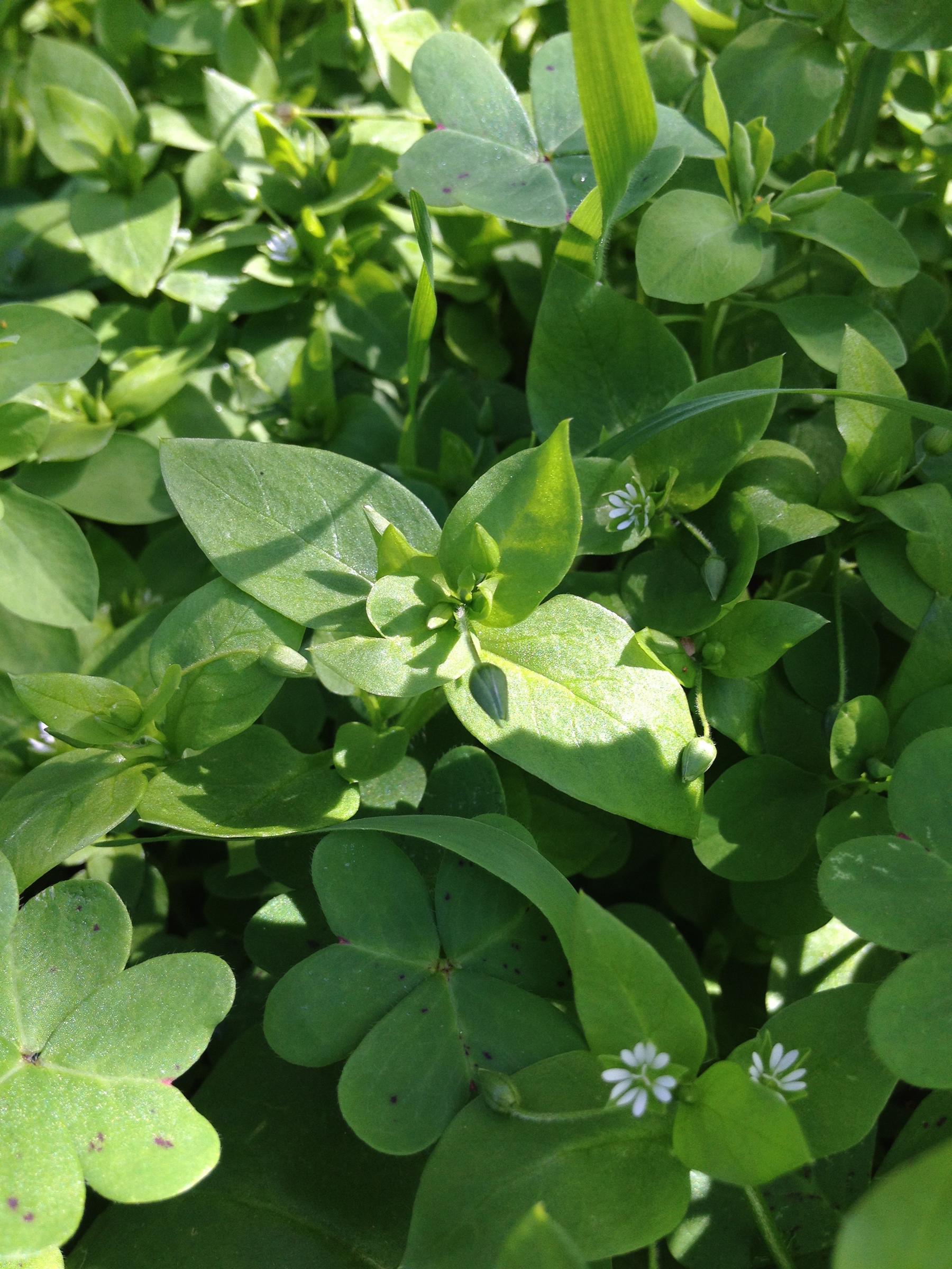 Not everything that is edible is bitter or peppery. Chickweed, Stellaria media, a common backyard weed with tiny white daisy-like flowers and pointed oval leaves, had a mild flavor. According to Nyerges, it’s rich in calcium. Common mallow, with its round, dark green leaves and tiny purple flowers, also has a mild flavor, and is an abundant spinach substitute throughout the winter and spring.